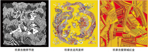 同样是以传统文化为元素,论品质、时尚度、当下潮流,玖章吉都是走在时代前列的,这也跟葛洪明的生活阅历和教育背景息息相关。作为中国美院的高材生,凭借专业敏锐度,葛洪明对将设计拼凑在一块、没有核心元素、文化理念、没有自我风格的做法是异常反感。他分析,一个品牌不是光看眼前的金钱利益,重要的是要静下心来去研究。所以玖章吉一开始就打定主意要做出更多原创设计,而且必须把体量、设计品质等掌握好。为此,葛洪明在设计之前,先将中国的传统文化,比如中庸之道、天人合一进行了一番彻底的研究,并且将传统文化的抽象理念融合到了围巾的设计之中,中国传统文化范围比较大,玖章吉到底要设计什么,什么能代表玖章吉的含义都是他在设计的时候需要考虑的问题。比如公司第一款围巾是龙凤呈祥,龙和凤最能代表中国,也是将中国传统文化用具象的符号来表达的一种方式。