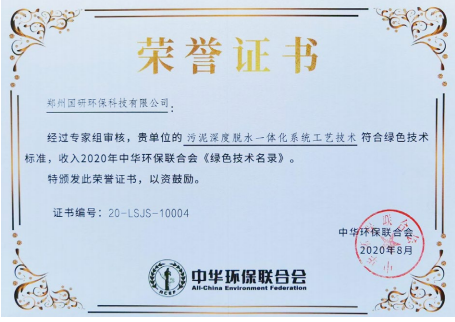 技术得到行业认可,企业得到国家认可。郑州国研环保科技有限公司拿到授权实用新型专利15项、授权外观专利3项、授权软件著作权15项以及公开发明专利3项。公司研发的“污泥深度脱水一体化系统工艺技术与成套装备”在2018年6月河南省机械工程学会专家组评价已经达到国际先进水平;2019年12月被国家生态环境部将列入“无废城市”建设试点先进实用技术(第一批)名单;2020年 5 月一体化污泥深度脱水系统经教育部科技查新工作站查新, 给予技术独创,生产工艺具有唯一性的结;2020年8月被中华环保联会收入《绿色技术名录》中。并且郑州国研环保科技有限公司荣获第八届中国创新创业大赛国家总决赛的优秀企业、在第八届中国创新创业大赛河南省赛区荣获一等奖、2019年“创客中国”河南省中小企业创新创业大赛获得年度总决赛第一名、2019“郑创汇”国际创新创业大赛年度总决赛中获得二等奖,同时拥有AAA级质量服务诚信单位、AAA级重合同守信用企业等资质证书。