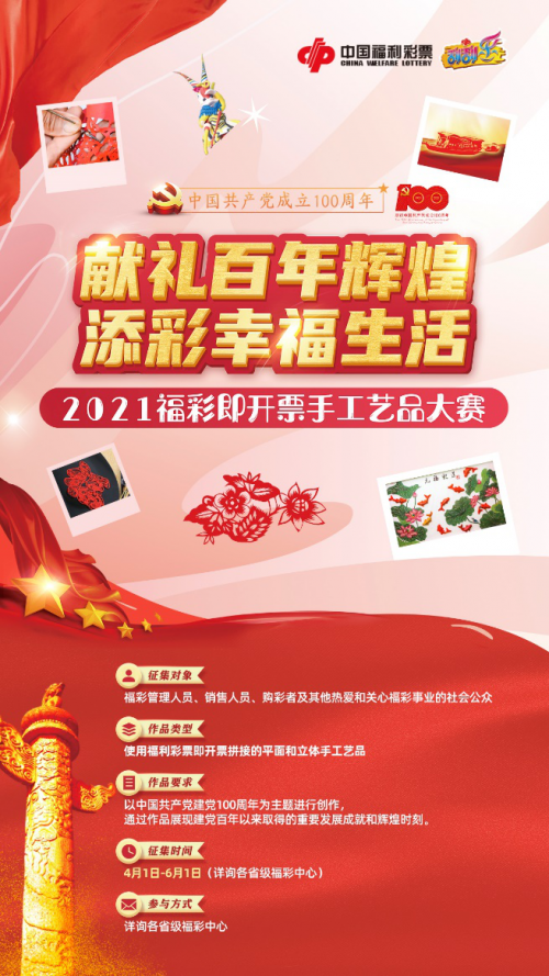 2021年是中国共产党成立100周年,也是“十四五”开局之年。新征程,新使命,为献礼建党百年,中国福利彩票发行管理中心(以下简称中福彩中心)于4月1日起,组织开展即开票手工艺品大赛。大赛以“献礼百年辉煌,添彩幸福生活”为创作主题,以福彩即开票手工艺品为载体,展现百年奋斗历程,记录党领导下的幸福生活,讴歌建党以来取得的伟大成就。