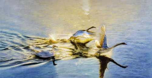 落日的余晖下,宁静的湖边上,天鹅在湖中嬉戏玩耍。波光粼粼的湖面,随着光影的浮动,不知不觉仿佛进入了天鹅的梦境梦里,天鹅展开双翅在璀璨的星河中自由翱翔,宛如热恋中的少女