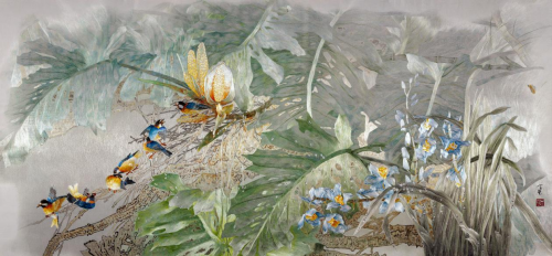 这幅作品由青年画家王建平老师手绘于透明蚕丝绢上,源于绣师平常对生活的观察,采用参针、套针、交叉针、翎毛针、乱针、自由针法等,表现动与态丶光与影的意与境,高度展现了西洋画与刺绣的双重融合与唯美。