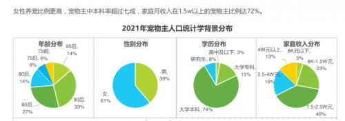 据《2021年中国宠物消费趋势白皮书》统计,宠物主中本科率超过7成,家庭月收入在1.5万以上的宠物主占比高达72%,其中主流为新生代已婚群体。从数据分布来看,这一群体的显著特征就是年轻、高学历、高收入、购买力更强。