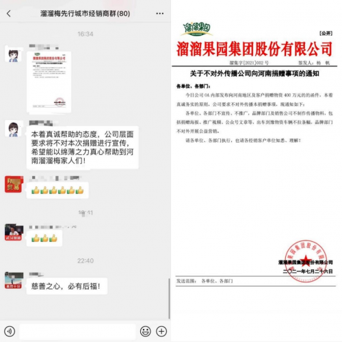 溜溜梅在内部通知里提到了不想对外公开的原因是,“本着真诚务实的原则”。尽管他们捐得并不少,但他们不想因此被讨论。只要心意到了,能够实实在在帮助到灾区,就已经达到了企业捐款的目的。