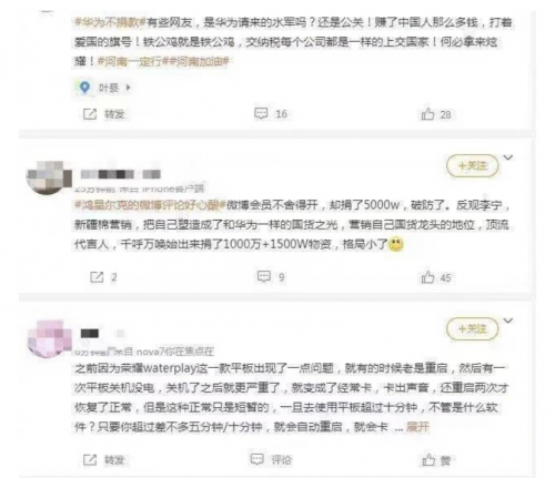 华为显然是无辜躺枪,低调行善反而变成了错误。在面对大灾大难时,通信保障的重要性可以排在第一优先级,而华为冲在了前面。但某些网友却并不买账,仅仅是因为没有到处宣扬被受质疑实属不应该;后来华为被迫公式捐款详情后,又被网友吐槽捐得太少。