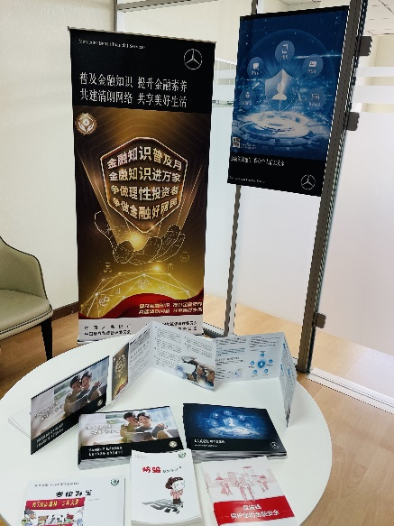 奔驰金融还与全国600家经销商合作伙伴携手开展金融宣传活动,通过在经销商展厅内播放电子海报、展示投诉电话与流程、分发宣传活动特制折页以及线上直播间等形式助力金融知识的普及。
