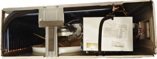 拧下4颗螺钉,就可以打开上盖。可以看到是双排换热器,电路板横置,电路板盒上面是金属防火板,并贴有电路原理图,便于将来检修。