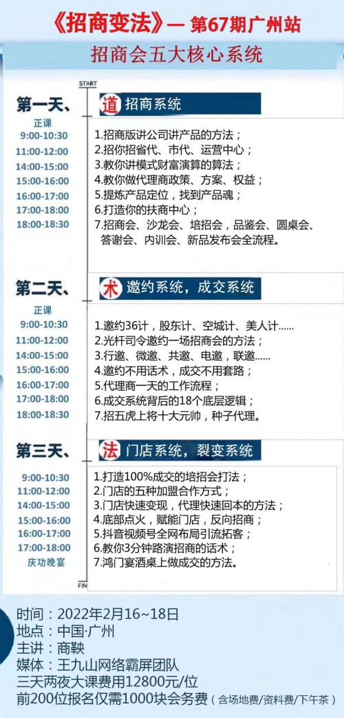 据悉,由大秦招商主办,王九山网络霸屏团队媒体宣发支持的大秦招商——《招商变法》—第67期广州站将于2022年2月16日在广州举行。