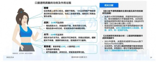 焦点福瑞达可以吃的玻尿酸上市后,在使用者的反馈当中,“由内而外”、“补水”、“易吸收”是最常被提到的几个高频词,这与焦点福瑞达口服玻尿酸的特性密不可分——小分子的玻尿酸,经胃肠道吸收进入血液中,送至皮肤真皮层,促进人体成纤维细胞产生玻尿酸,补充人体中缺失的玻尿酸。焦点福瑞达以玻尿酸为核心,提出了“玻尿酸+”的概念,将玻尿酸与其他成分结合在一起,达到1+1>2的效果,以“玻尿酸+”的科技力量,给用户多样化、针对性的产品体验。口服透明质酸的出现,创新了外用涂抹式透明质酸的使用场景与满足了注射式透明质酸所覆盖不到的消费群体,从而开辟了一条新的补水护肤新赛道。