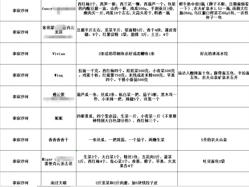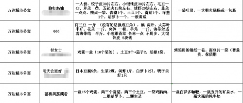 鸡蛋一盒(10个装)、小青菜一斤(不要那种特别大白色部分的)、鲜牛奶中份2瓶(牌子不限,日期麻烦看一下)、5L的农夫山泉……这张表里,不仅有业主的地址、电话、采购物资等相关信息,还详细记录了业主们的“定制化”需求,不同的口味、生活习惯都能满足。
