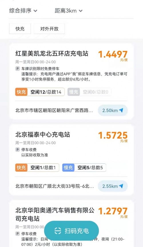 车主打开「车生活频道」,可方便查看到附近的合作充电站,平台将实时显示充电价格,以及充电桩的空闲数量,帮助车主更好规划相应行程。