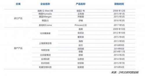 在我国,轻医美领域主要分为2大板块,一是注射美容项目,一是仪器类美容,而在注射美容领域,又主要分两大块:玻尿酸注射与肉毒毒素注射。其中,目前合规上市的玻尿酸品牌有数十种,功效主要包括进行美塑疗法、塑形填充、轮廓提升等,经过十数年的发展,国内玻尿酸品牌竞争局面越来越激烈。