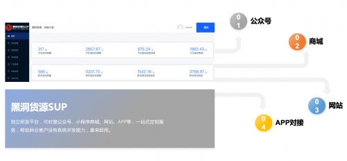 亿奇达黑洞货源SUP是亿奇达独立研发的商务平台,为企业和渠道伙伴提供系统服务,涵盖微信公众号对接、小程序商城、网站、APP等系统API接口支持,一站式系统定制服务,帮助异业客户在没有独立系统开发能力的情况下,拿来即用。