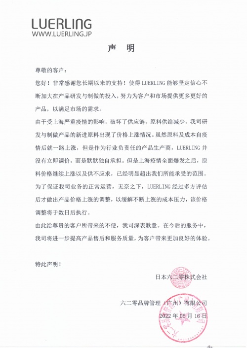 据了解,LUERLING遇到了原料短缺以及价格不断上涨、供不应求的现象,给公司的经营带来了一定的挑战。经评估,决定对产品价格进行上涨调整,特向广大客户在此声明。
