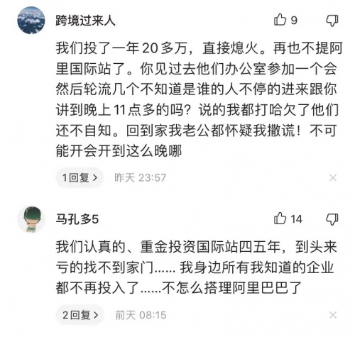 一晃五年过去了,国际站的运营简直就成了鸡肋,阿里业务员说做国际站的也离不开二八定律,你们公司已经很厉害了,至少没亏!做企业不赚钱难道还光荣?到了年底续费的时候就成了阿里的韭菜,割了一茬又一茬。今年经济本来就不好,看来是被割得最厉害的一次了,年底还是打道回府撤回工厂吧。