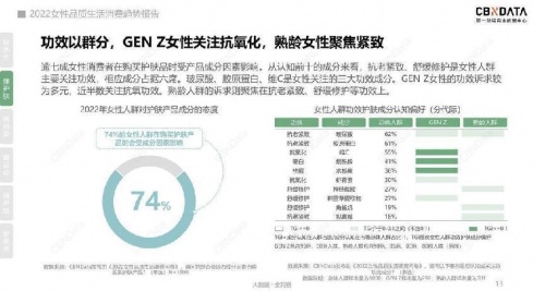 据360趋势调查,90、00后在抗衰老中数量众多,19-24岁抗老分布占75%。对于女性来说,她们青睐的美容护肤项目中,抗老保养提及率达72.2%,抗老已经成为消费者日常保养更关注的内容。