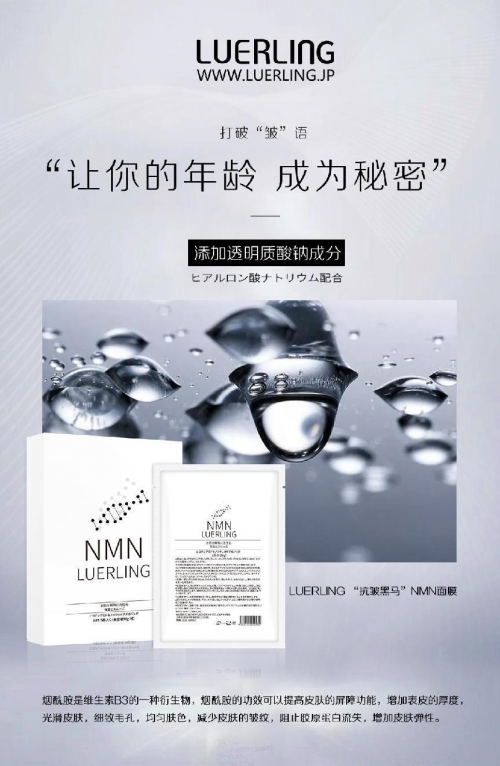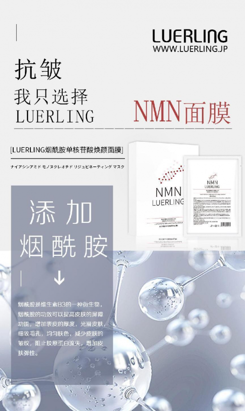LUERLING新品NMN面膜(LUERLING烟酰胺单核苷酸焕颜面膜和LUERLING烟酰胺单核苷酸水润面膜)的质地很服帖,精华超多。精华中的王牌成份是NMN长寿因子β-烟酰胺单核苷酸、淡黑因子烟酰胺、透明质酸钠。而核心成份NMN作用于肌肤可渗透皮肤直接作用于真皮组织,延缓细胞衰老,加快新陈代谢,增加皮肤再生能力,让肌肤永葆年轻活力。烟酰胺能快速抑制黑色素的生成,阻止黑色素沉淀,促使已有黑色素的瓦解。透明质酸钠能够密集补充水分,提高肌肤补水力,同时具有清除自由基,防止肌肤老化的作用,是兼具补水、保湿等功效的嫩肤成分,让你的皮肤变得白皙透亮。
