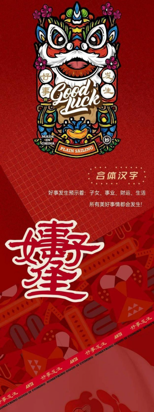 本次安踏新年“好事发生”系列,由全球IP整合玩家——润竹文化促成妙手回潮核心团队倾力打造象征吉祥美好寓意的“醒狮图案”及“好事发生”创意合体汉字,搭配元宝、花等吉祥元素,表达祈福纳祥的美好心愿。