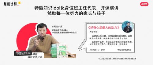 作为小红书首个教育垂类IP,「不费妈值班室」将在2023年暑期重磅上线,除了站内的流量扶持,小红书还会联合官方媒体和行业大咖,并落地到真实的生活场景中。比如联动知名科普博主「无穷小亮」,以好奇心为主题来讲述如何培养孩子的求知欲,减轻父母焦虑。