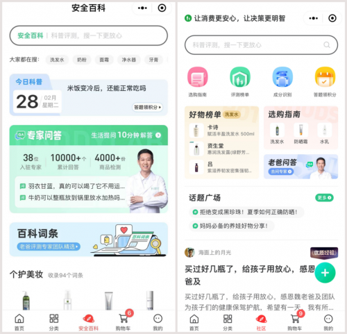 从1.0(左图)到2.0(右图),老爸评测小程序改“百科”为“社区”,吸引用户更多分享内容