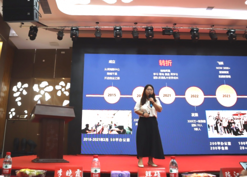 然后由来自中山市六创客服饰有限公司的总经理、阿里巴巴超级卖家商家李晓霞现场分享了以“C端到B端两年实现20倍增长”为主题的演讲,现场揭秘了企业经营高质量增长的三大密码。