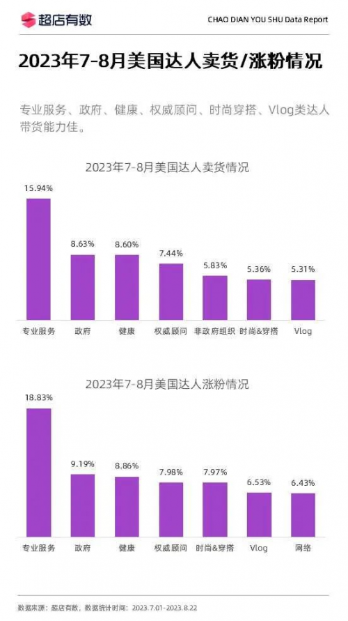 据超店有数统计,美国TikTok达人数增长态势明朗。不管是销售额分布,还是涨粉数分布,专业服务、政府、健康、权威顾问、时尚穿搭、Vlog六类达人带货能力、亲民程度都当属最优,其中专业服务类达人以15.94%的GMV占比、18.83%的涨粉数占比断层领先。