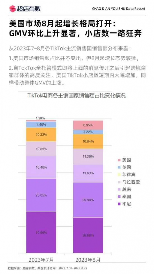 据超店有数,TikTok美国市场GMV大盘自8月起环比增长明显,较7月上涨27.9%,美国市场的销售额占比也由4.6%提升至6.95%。究其原因,美国TikTok小店店铺数量增长情况不拉后腿,由7月7308家上涨至8月截至日前的8605家,环比上涨17.7%。虽然目前美区与东南亚市场GMV仍存在较大差距,但背靠庞大高质量用户群的美国市场潜力巨大,看来大家都不想错过这个大蛋糕。