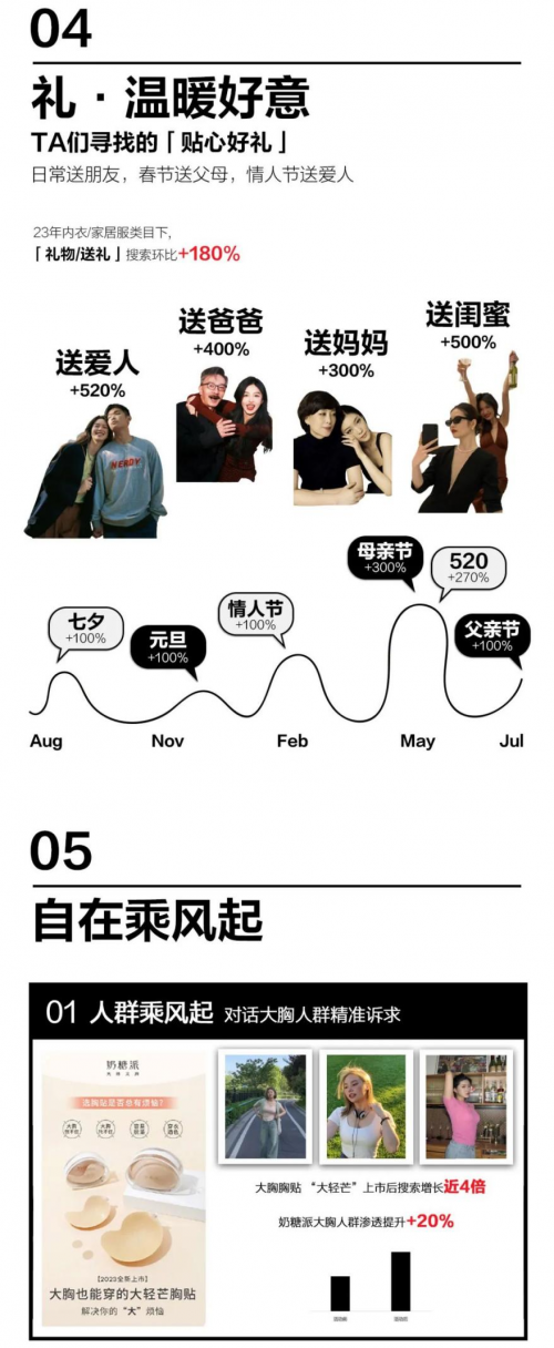 本期『Trend 趋势』中,小红书以目标用户消费诉求、消费偏好、消费场景及节点为洞察维度,洞见内衣赛道四大新趋势:【身· 无拘体验】、【心·百变自在】、【质·呵护四季】、【礼·温暖好意】,助力品牌抓住小红书高增长生意机会、挖掘内衣赛道爆品趋势确定性、踩中用户“心头好”。