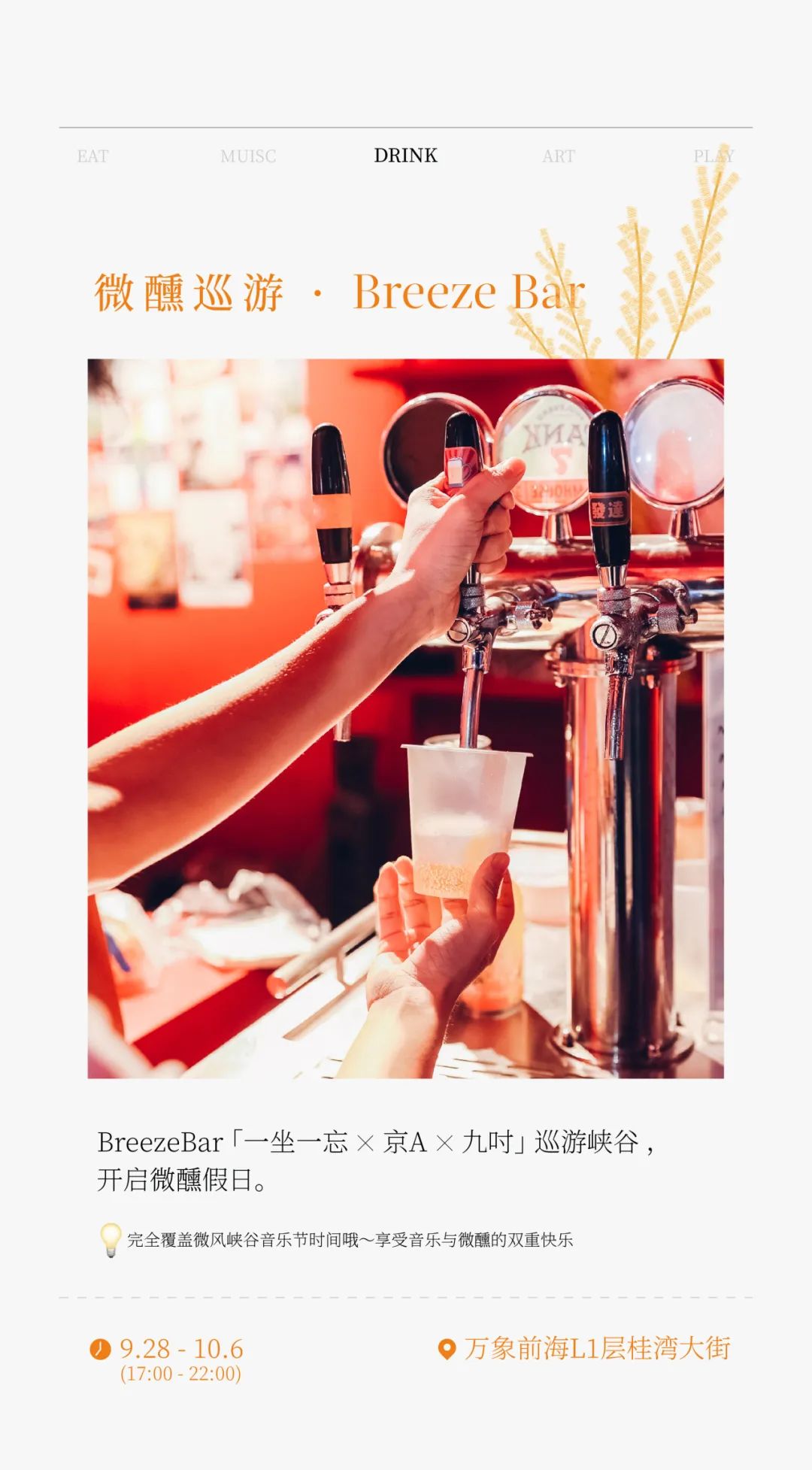 9月23日-11月23日,“长成”艺术联展、“丰收赞歌:当艺术诠释生产与生活”艺术作品联展开展;9月28日起,微风音乐大道街区焕新,NEWSLAND亲子乐园开园;9月29日-10月6日,开展微醺快闪巡游活动;9月29日-10月2日,万象前海联合QQ音乐举办微风峡谷音乐节。