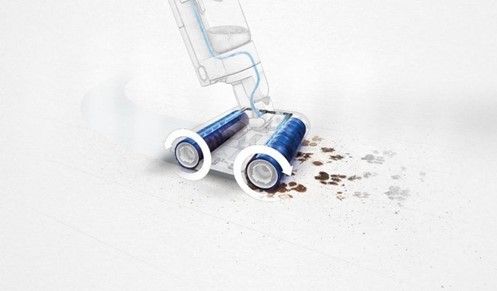 此外,每个主滚筒表面每平方厘米覆盖64,800根超细纤维,通过其高密度刷毛和高吸水性,确保液体污渍被充分吸附,固体的污垢、碎屑和毛发也被包裹并卷入。