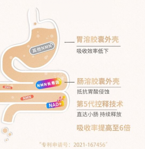 2022年,NMN長寿因(NMN Sirtuin)升级Acid ProTec®专利配方(日本专利申请号:2021-167456),使NMN更小且更容易吞咽,从而使得NMN到达肠道吸收转化,让NMN提高6倍高效吸收利用率!